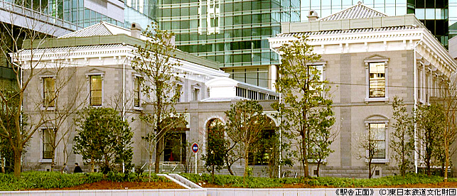 本物の駅舎は関東大震災により消失。昭和61年に貨物駅としての役目を終えた後、平成3年から始まった発掘調査で開業時のプラットホームや駅舎の遺構が発見された。その遺構のほぼ真上に、開業直前に撮影された外観写真を手がかりとして忠実に模した駅舎を建築。かぎりなく実際に近い姿でよみがえった。周囲をひとめぐりすれば、壮麗な建築を楽しみつつ、明治のままの駅舎正面玄関の階段(一部)、プラットホームの遺構といった国指定の史跡にも出会える。