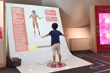 体にまつわる科学を探究する「わたし」の展示コーナーで、からだスキャナーを体験する子ども。取材当日も小さな子どもたちには体を動かす体験展示が大人気。ハンドルを回して電気をためビルのゴンドラを動かす発電チャレンジ、港区の海をまるで潜水艦に乗っているような気分で水深別に観察できるみなとエレベーターなど、科学を勉強しているというよりは、アトラクションで遊びながら体感的に仕組みを理解し、自然と気づきを得るような、子どもたちに馴染みやすい展示として工夫されている。