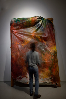 小林は、絵の具をチューブから直接手にとり、カンヴァスの布地を片手で支えながら擦り込むようにして色を載せ、同時に木枠に張りながら絵画を立ち上げていくという独自の手法で、絵画の在り方を探求する作家だ。